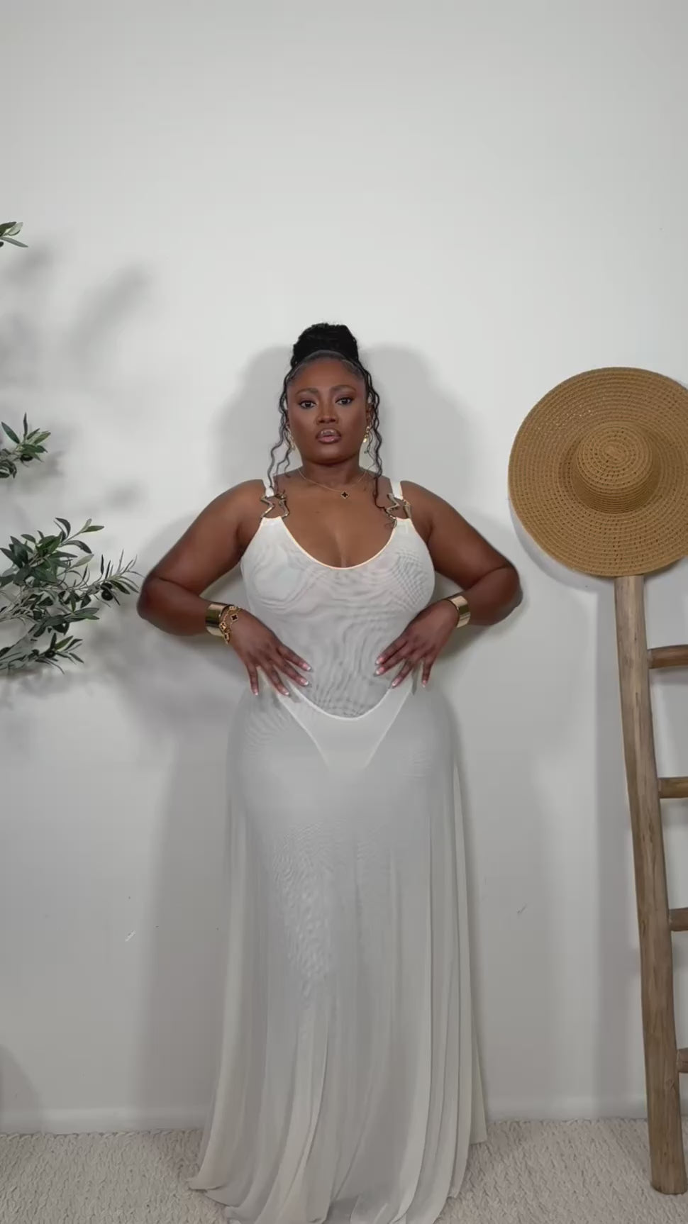 Maxi dress with a Bodysuit / Undergarments design that is meant to be seen through the dress.